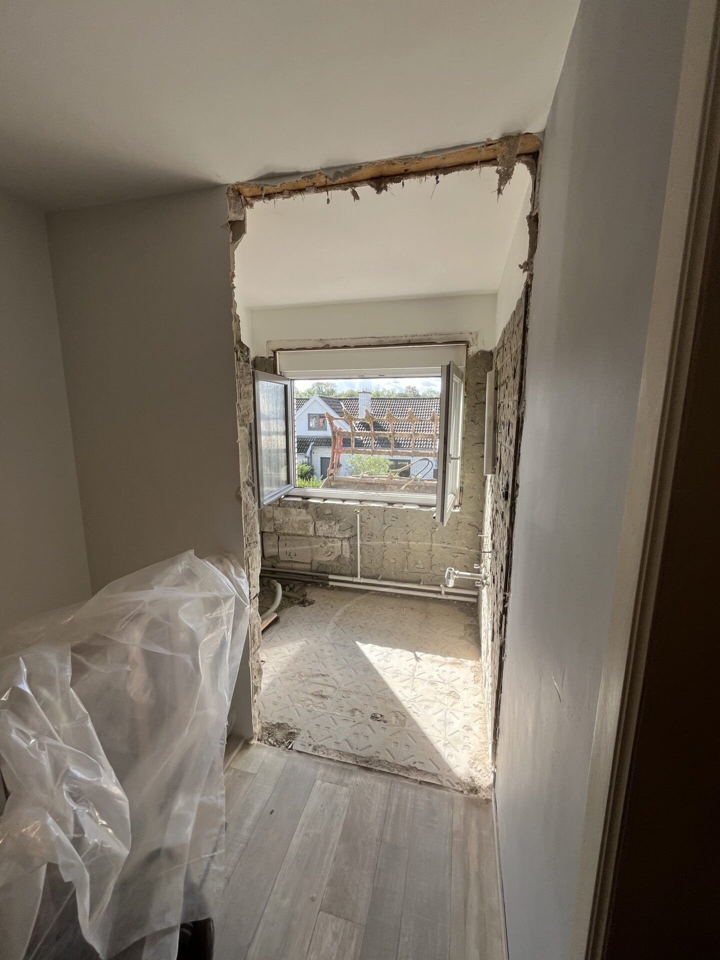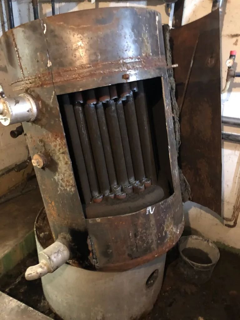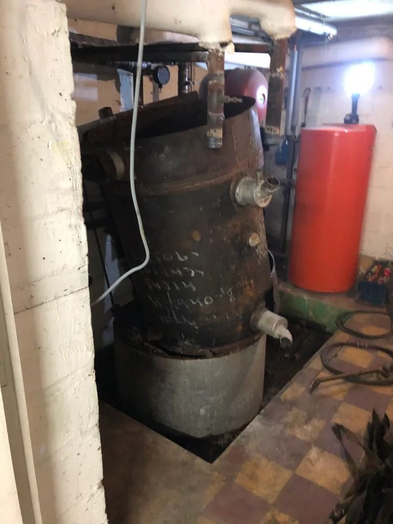 Découpage d’un très vieux ballon sanitaire au découpeur (chalumeau) car ne passait pas par la porte.