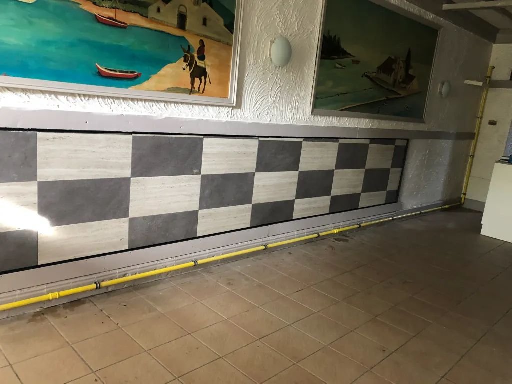 Découpe et pose de carrelage grand format sur table de coupe professionnelle, habillage des murs de la douche à l’italienne et de la niche WC suspendu avec système de nivellement par croisillons.