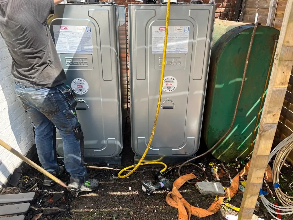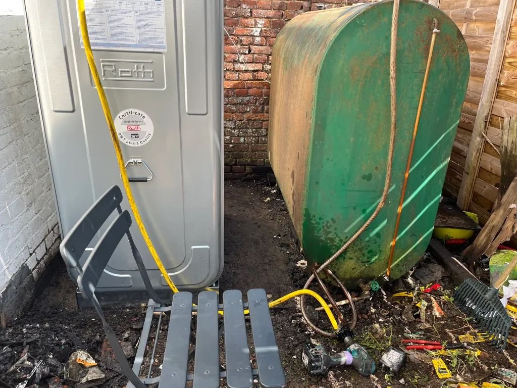 Retrait d’une ancienne citerne à mazout vétuste et oxydée, et installation de deux nouvelles cuves Roth DWT Plus 3 à double paroi, raccordées entre elles. Une mise en conformité qui garantit sécurité et fiabilité du stockage de combustible.