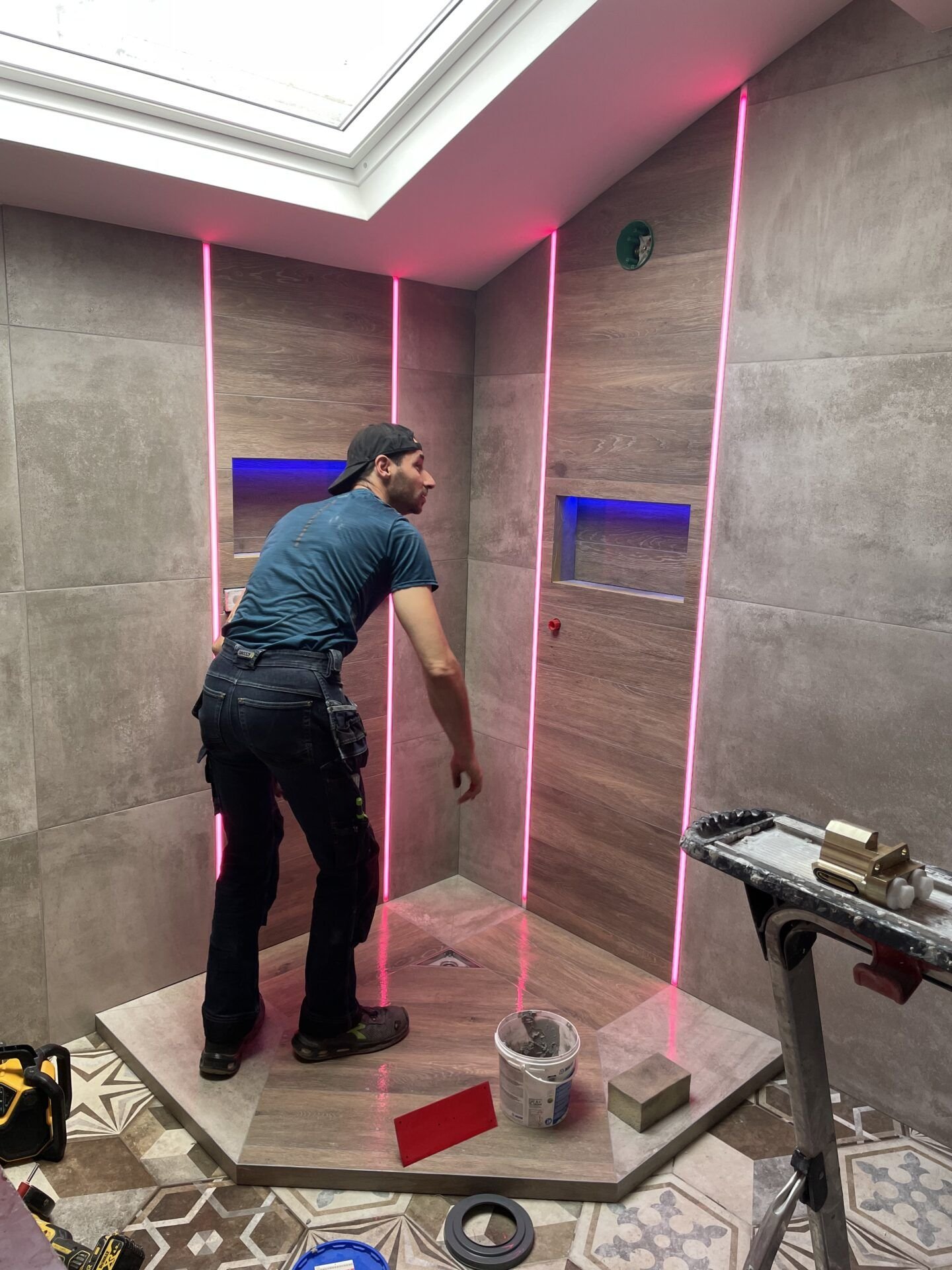 Réalisation d’une douche d’angle en carrelage imitation bois et béton, avec receveur surélevé, double niche encastrée et profilés LED RGB intégrés dans les joints verticaux. Un rendu moderne et soigné sous puits de lumière naturelle.