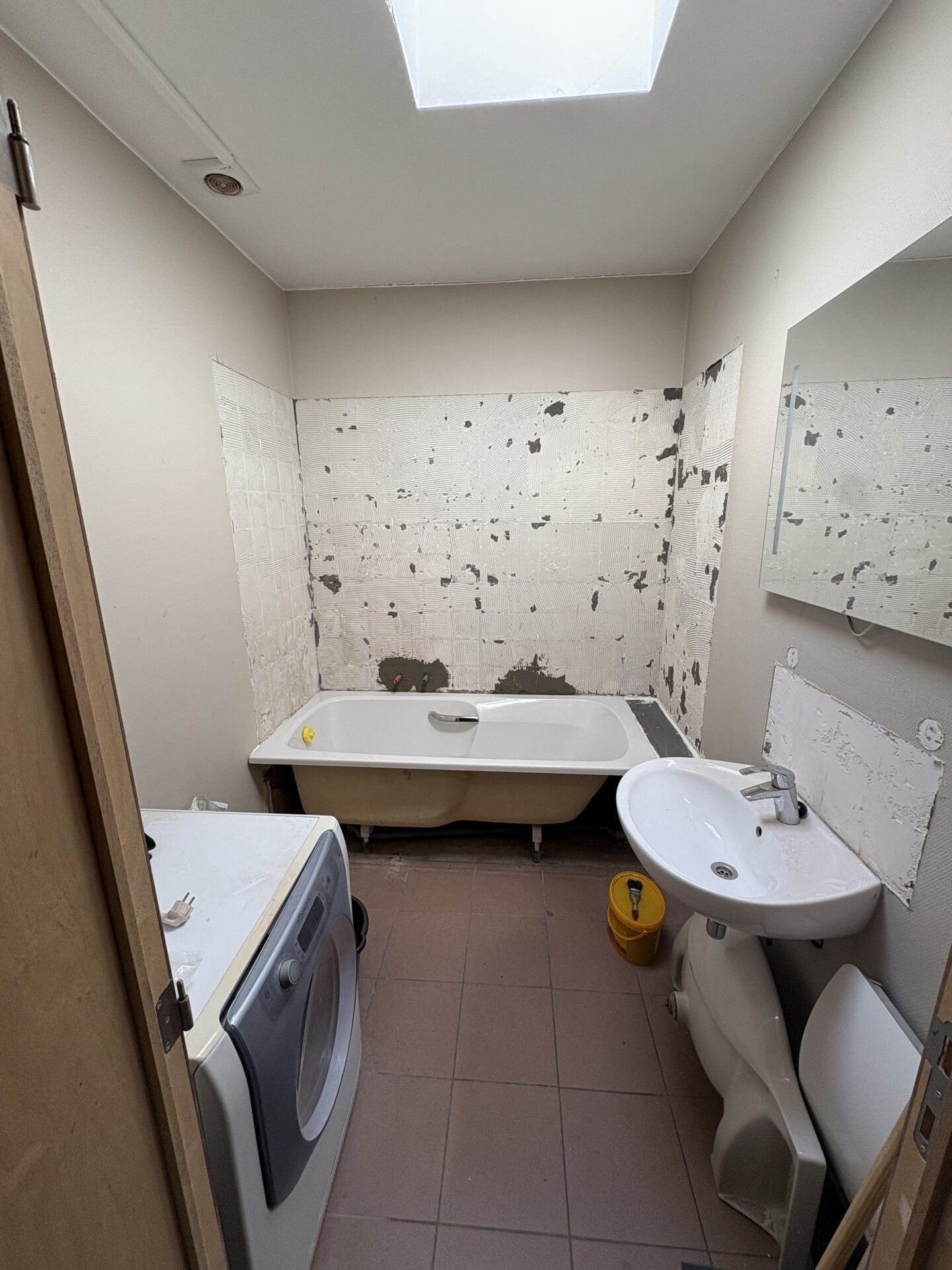 Dépose de l’ancienne baignoire et de l’habillage mural, mise en place de panneaux d’étanchéité (type Wedi), puis installation d’une nouvelle baignoire encastrée avec carrelage beige grand format, colonne de douche pluie et pare-bain en verre pivotant.