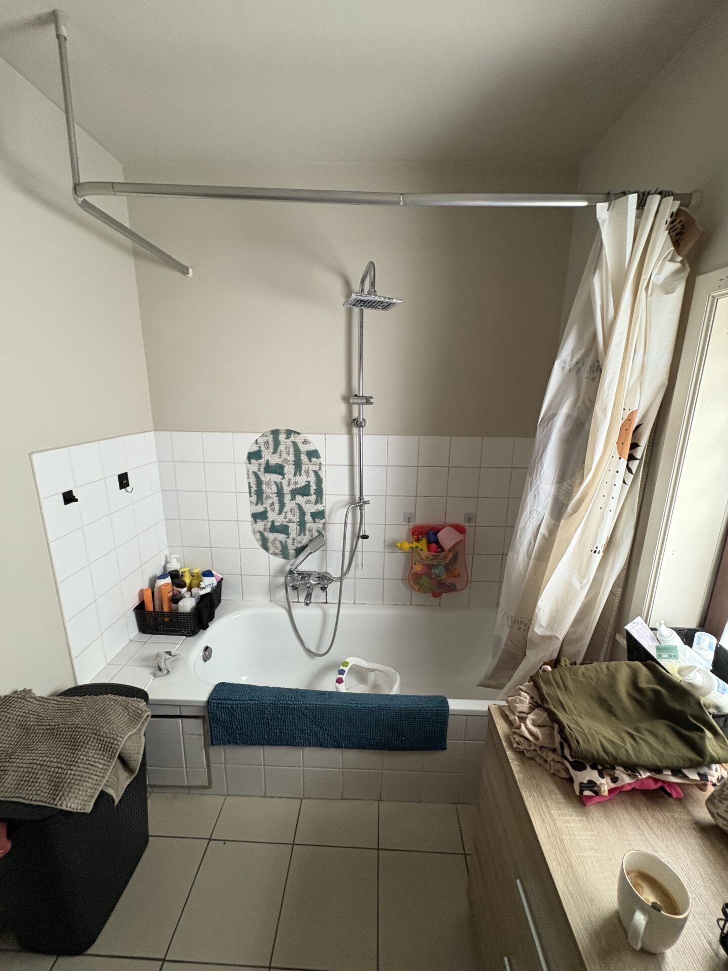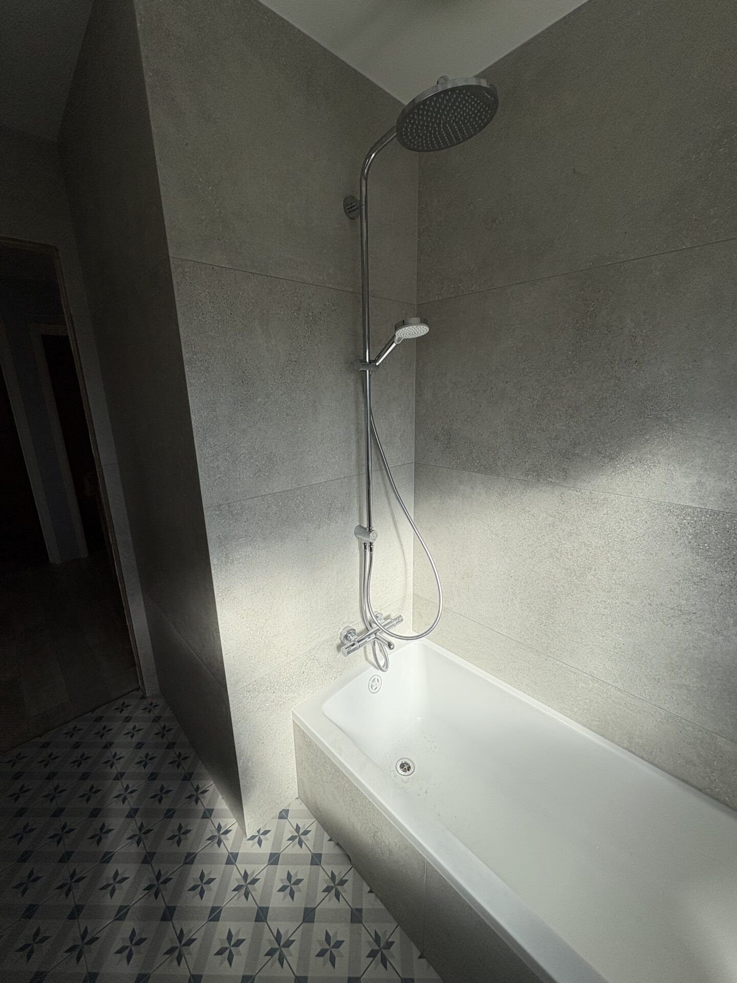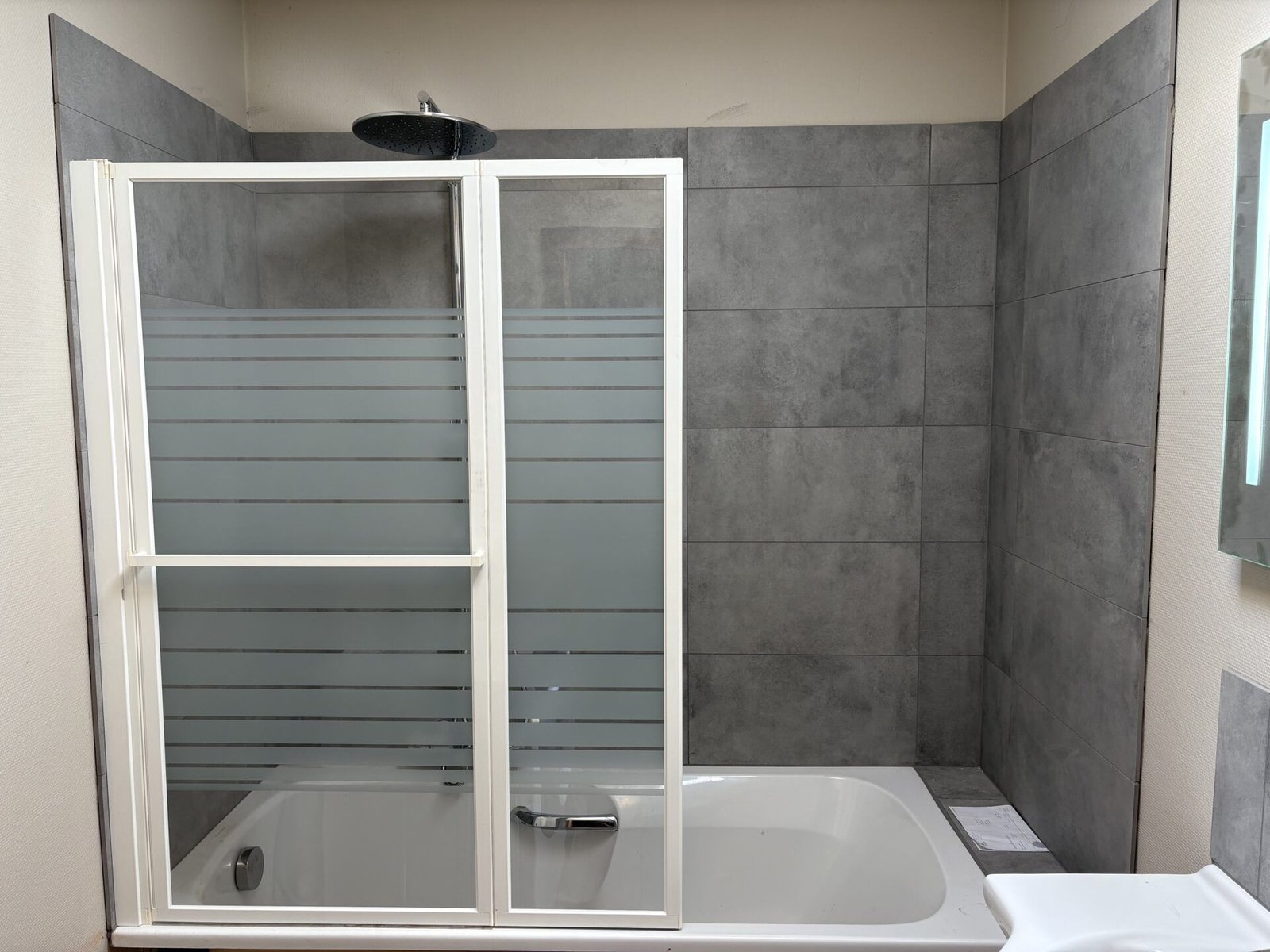 Remplacement de l’ancien habillage baignoire (carrelage blanc basique et rideau de douche) par un carrelage gris anthracite grand format, une nouvelle baignoire avec colonne de douche pluie et un pare-bain vitré à volets pliants.
