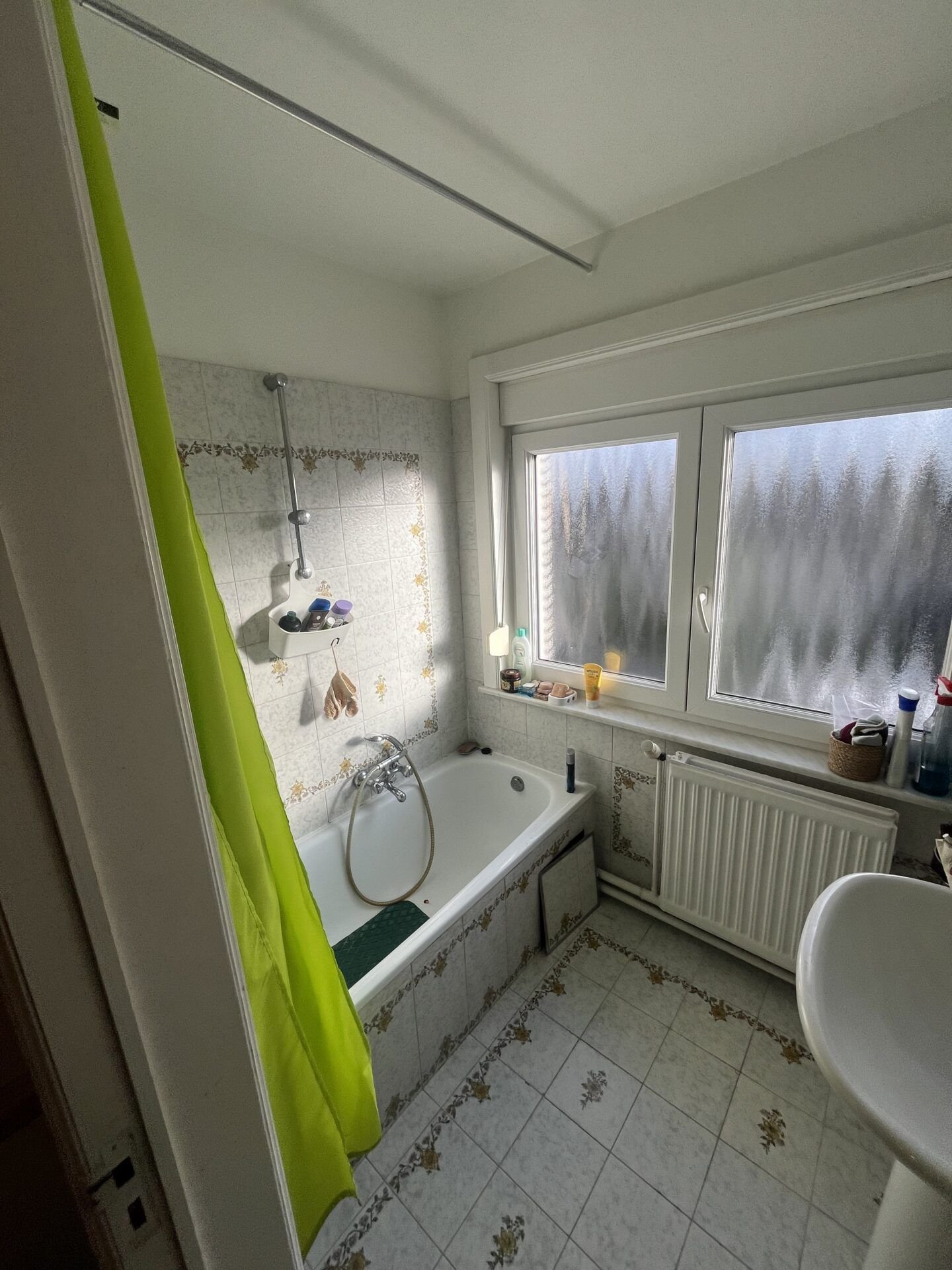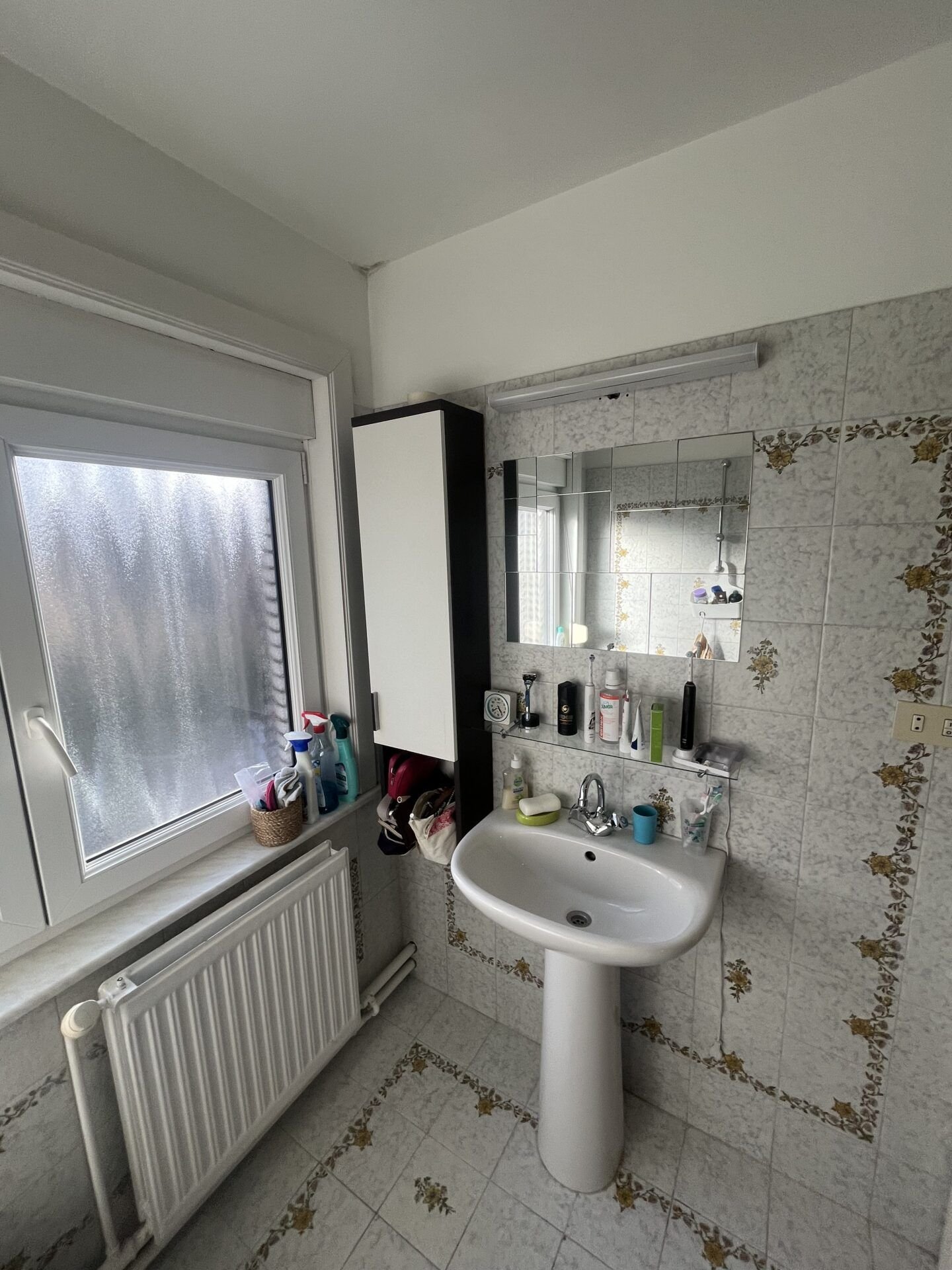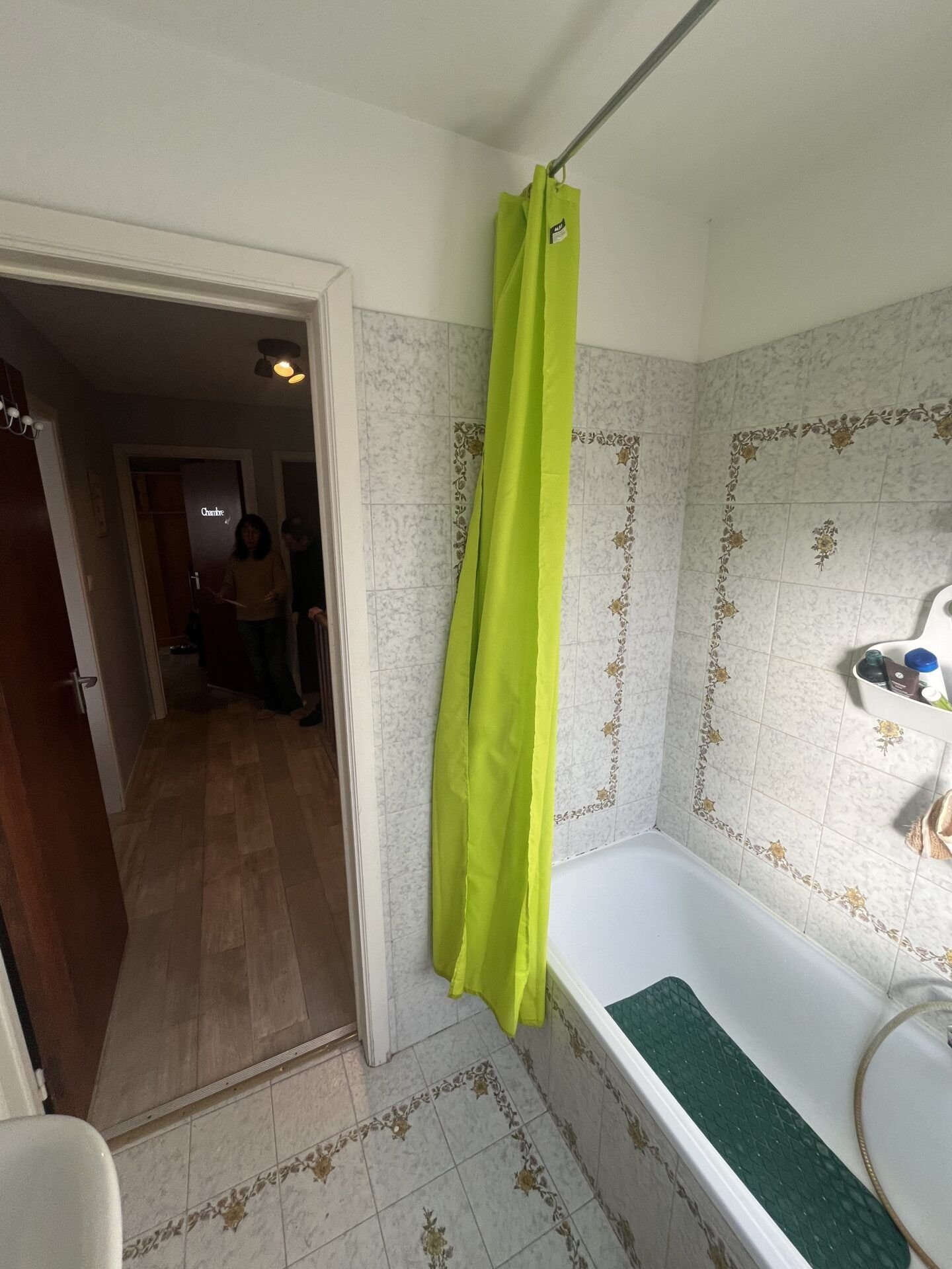 Remplacement de l’ancien habillage baignoire (carrelage blanc basique et rideau de douche) par un carrelage gris anthracite grand format, une nouvelle baignoire avec colonne de douche pluie et un pare-bain vitré à volets pliants.