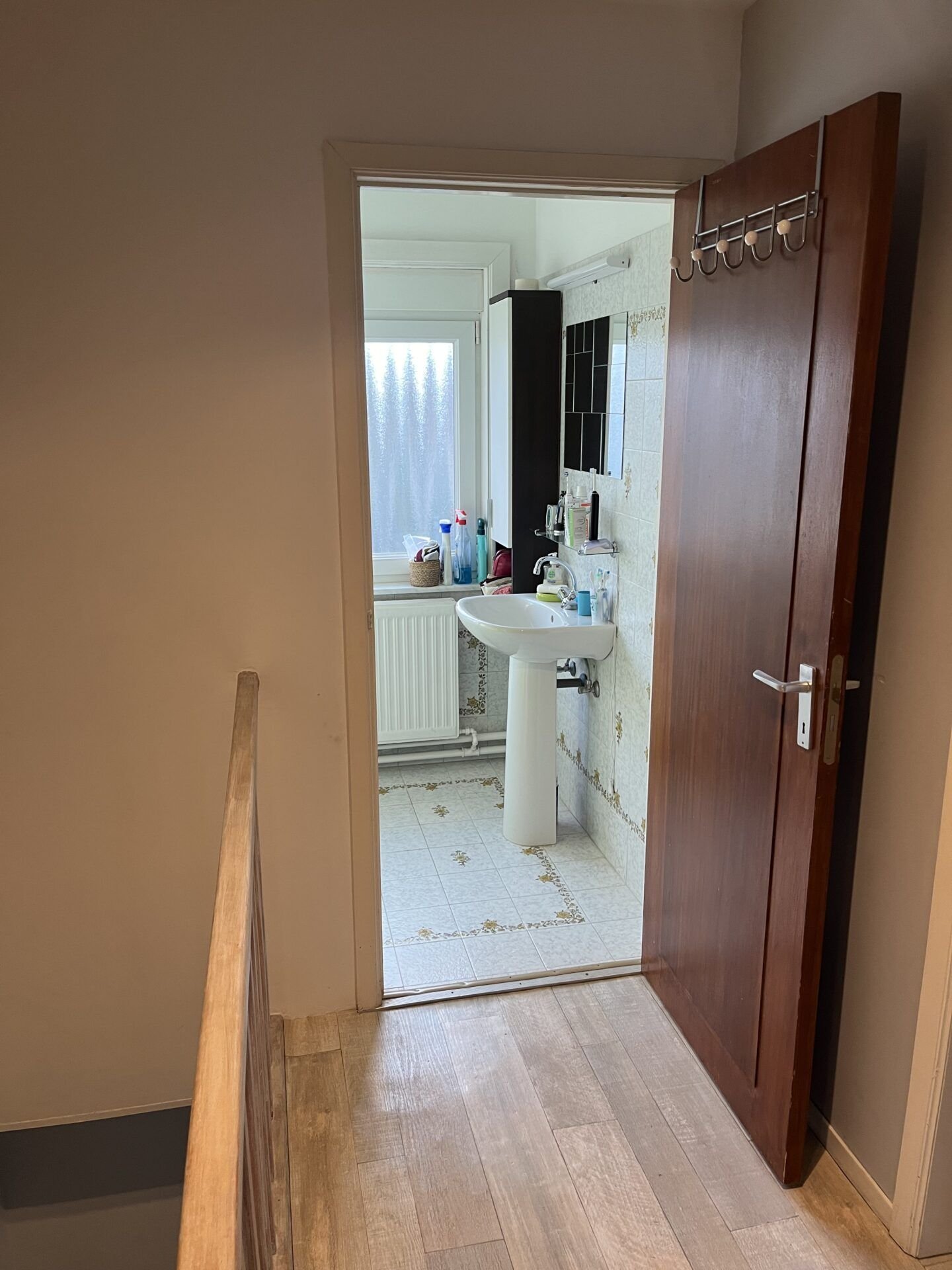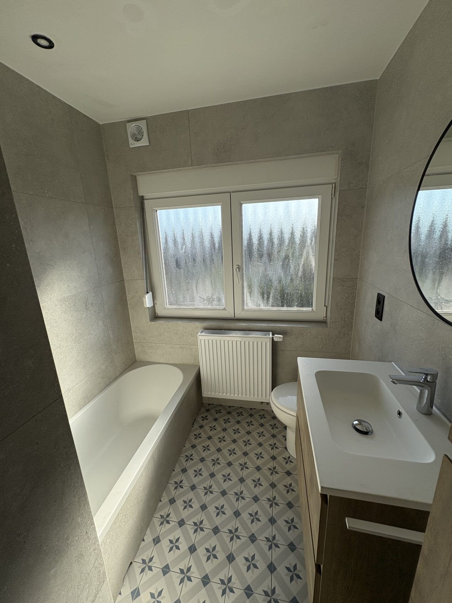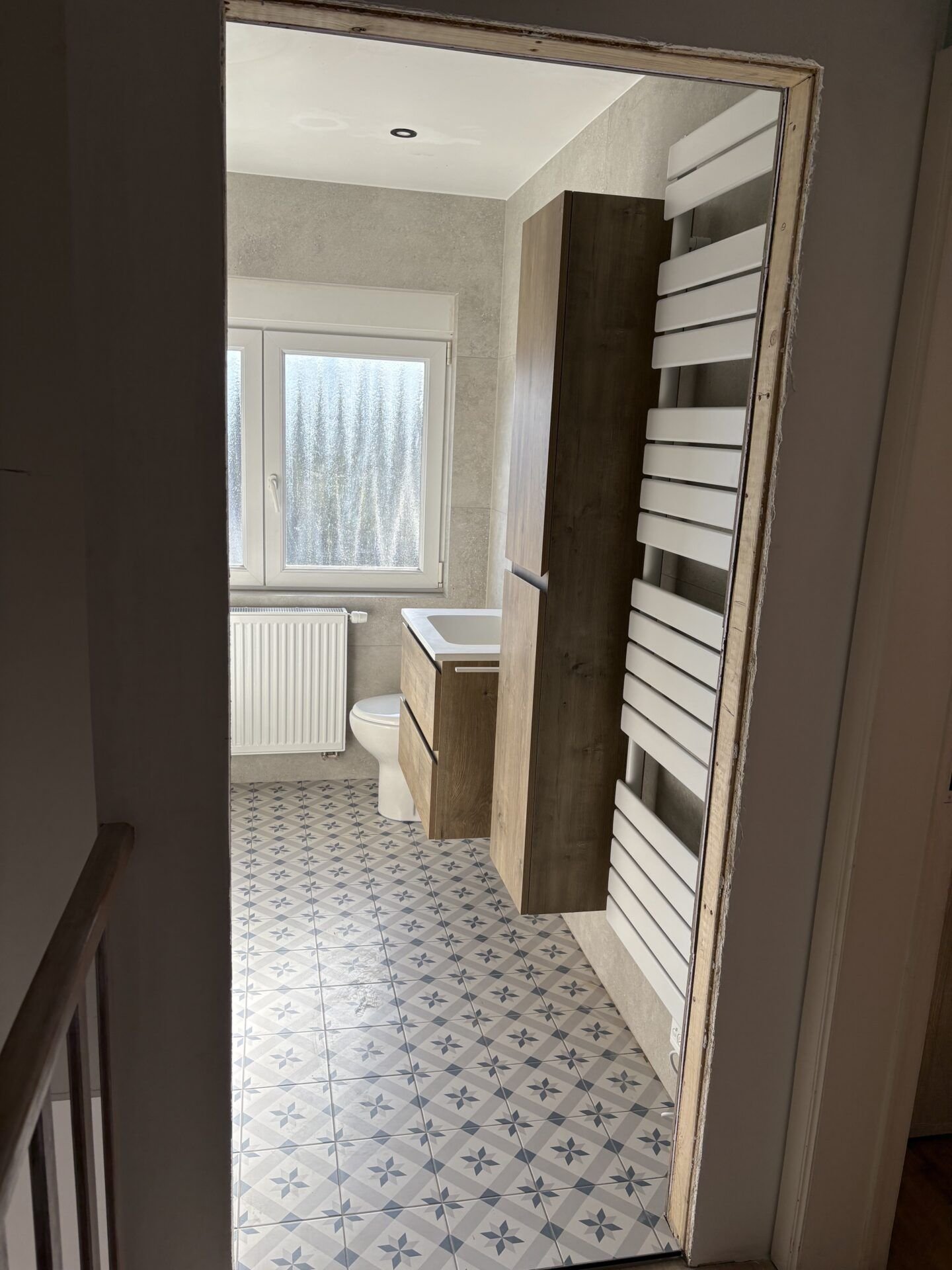 Transformation totale d’une salle de bain datée : démolition, pose de plaques Gyproc, nouveau carrelage effet pierre et sol à motifs géométriques bleus, installation d’une baignoire encastrée avec colonne de douche, meuble vasque suspendu en chêne, miroir rond, sèche-serviettes et VMC.