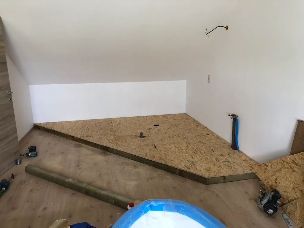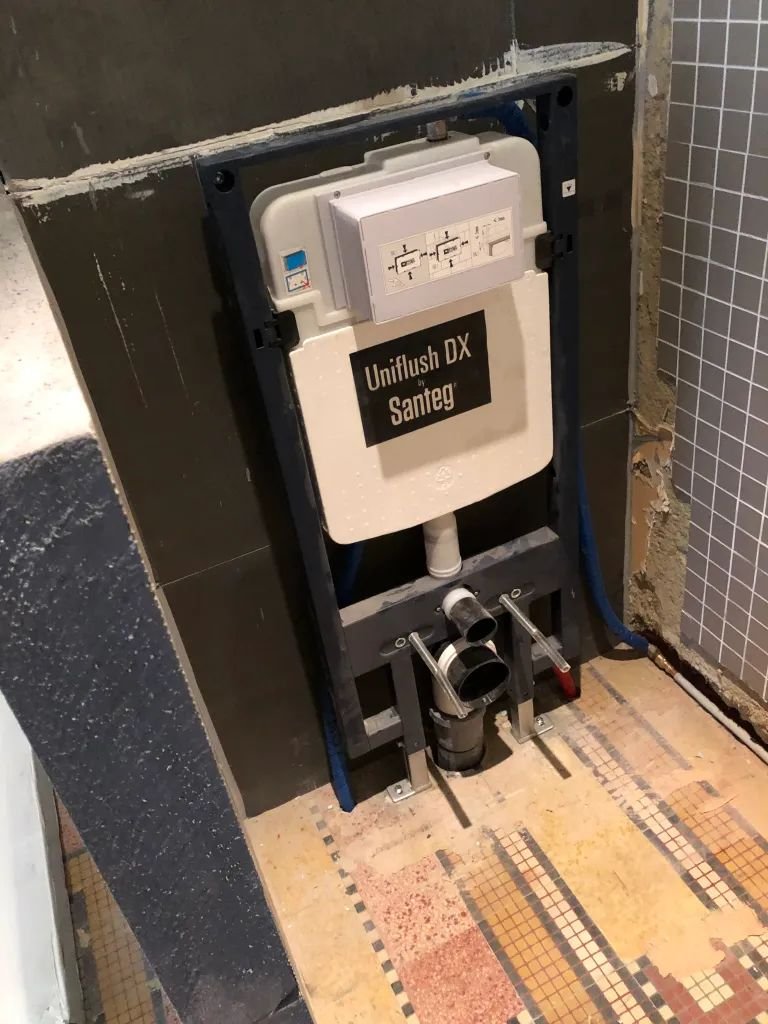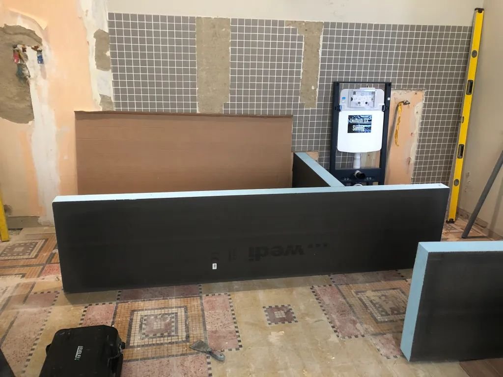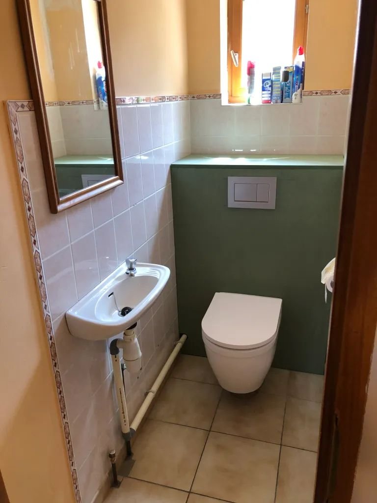 – Remplacement d’une toilette par un WC suspendu, habillage en MDF.