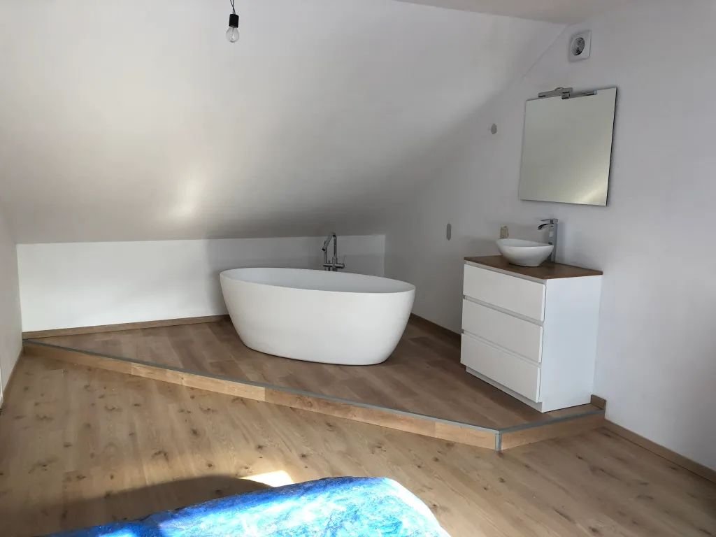 Petit coin salle de bain sur podium. Baignoire ilot et meuble posé au sol, le tout dans une chambre.