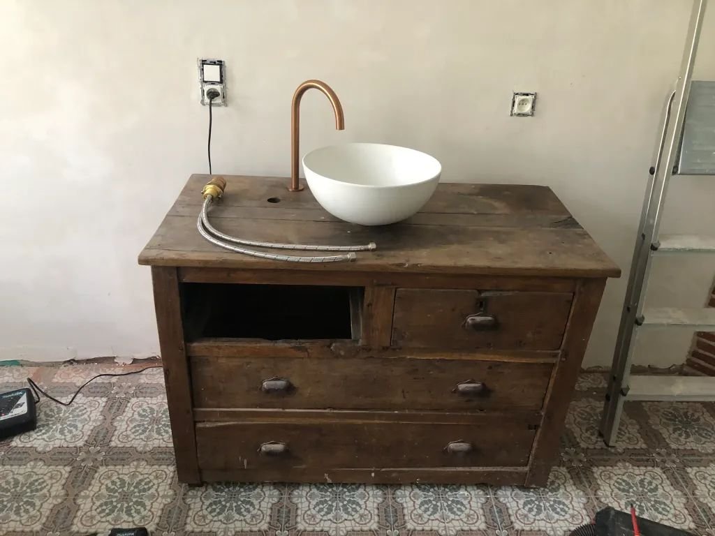 Création d’une salle de bain rustique, ancien meuble transformé en meuble lavabo, robinetteries en bronze, carrelage rétro …